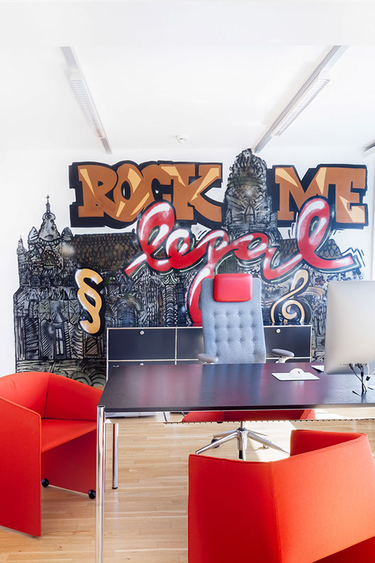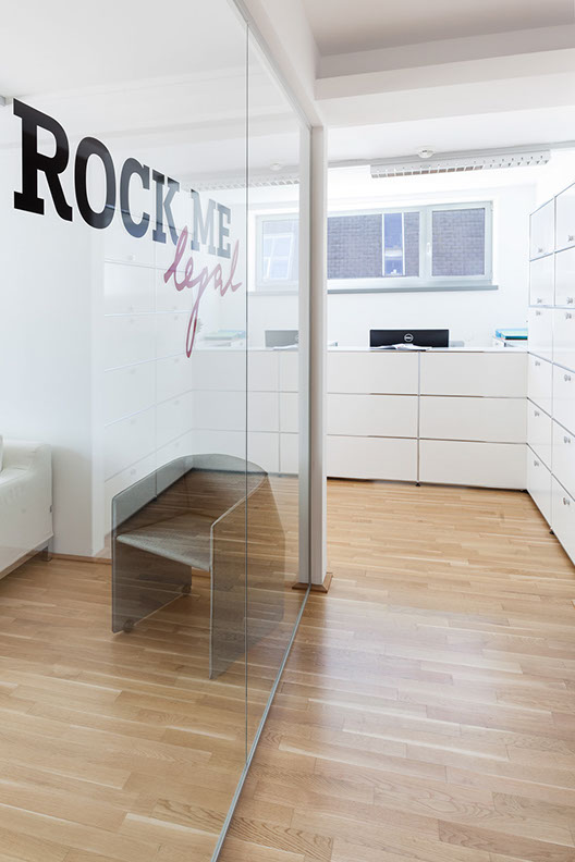 Rock me. legal … die etwas andere Anwaltskanzlei. Graffitis und das Motto „come as you are“ würde man nicht umgehend mit einer Anwaltskanzlei in Verbindung bringen. Das und einen sehr ehrlichen, direkten und menschlichen Umgang mit seinen Klienten, welcher die Firmenphilosophie ausmacht – galt es nun auch im Interior Konzept umzusetzen. Spannend war es den Spagat zwischen der repräsentativen Funktion einer altehrwürdigen Branche und einem neuen Zugang zu der Materie auch im Interior Konzept widerzuspiegeln. Wichtig waren Flexibilität um für das wachsende Unternehmen und neuen Mitarbeitern auch zukünftig schnell einen weiteren Arbeitsplatz zu schaffen oder gegebenenfalls die räumliche Situation wieder ändern zu können.